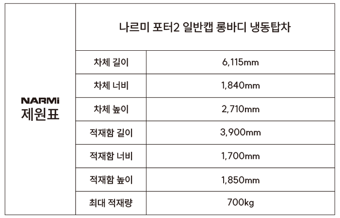 나르미 포터 일반캡 롱바디 베이직 냉동탑차