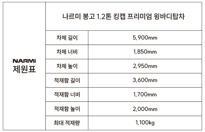 나르미 1.1톤 봉고 킹캡 프리미엄 윙바디탑차