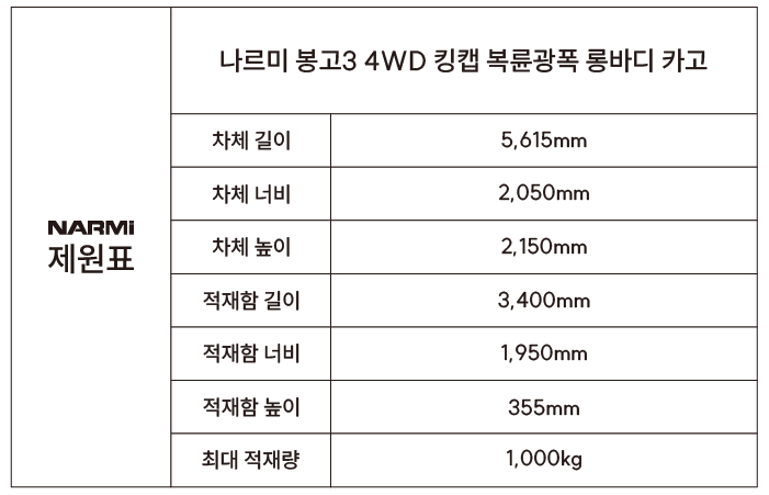 •광폭 카고 적재함 [3,400mm x 1,950mm x 355mm]