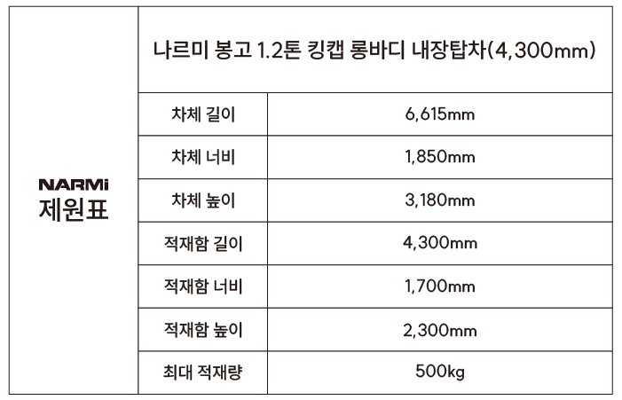 ▶나르미 1.2톤 봉고 킹캡 롱바디 내장탑차 제작